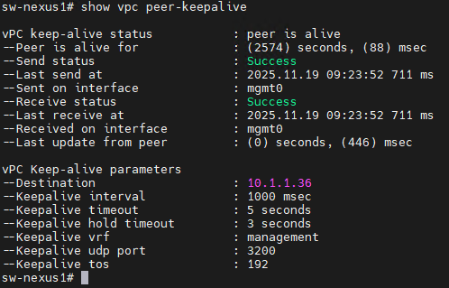 vPC keepalive slúži na detekciu životnosti peer zariadenia a zabraňuje split-brain stavu. Tento príkaz zobrazuje: