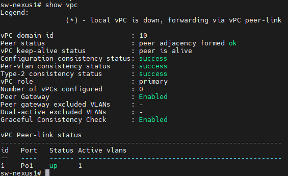 Príkaz slúži na základnú kontrolu stavu vPC domain. Poskytuje informácie o: